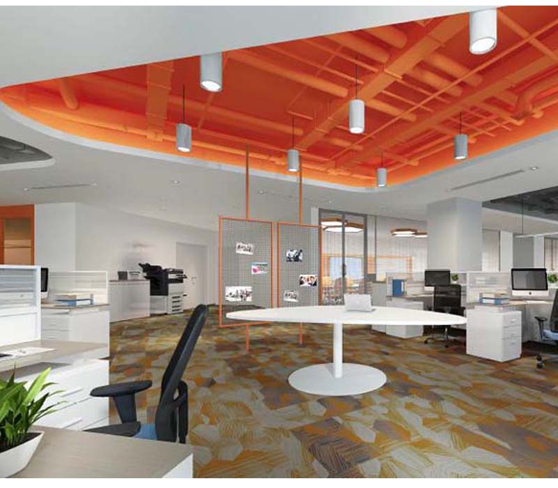 如圖所示:在整體純粹白與神秘黑的簡(jiǎn)約色彩基礎(chǔ)上,在天花造型燈具、辦公桌椅家具、部分墻面包邊、部分天花造型、走廊過(guò)道墻面等區(qū)域,巧妙融合暖色系,與噴涂幾何造型相結(jié)合,創(chuàng)意工業(yè)風(fēng)裝修風(fēng)格手到擒來(lái),關(guān)鍵是還不貴!