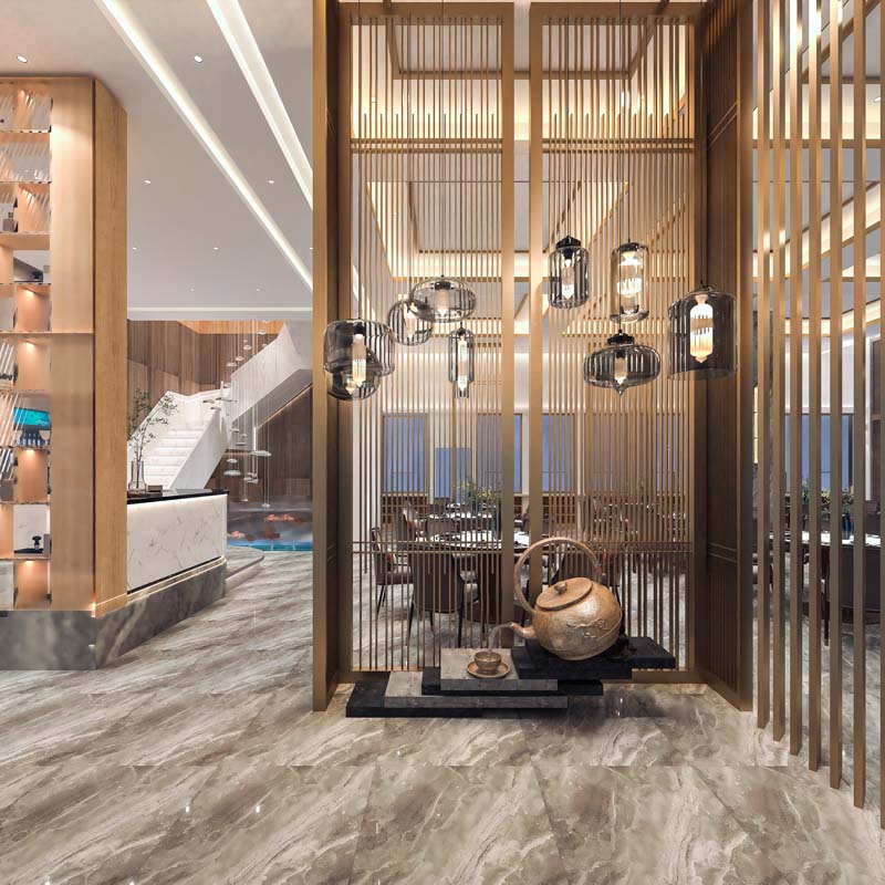 基于現(xiàn)代輕奢感“高檔宴會(huì)型餐廳”定位,為滿足消費(fèi)者的視覺(jué)、觸覺(jué)等諸多感官體驗(yàn),覃工選擇著重使用深淺不一的木色作為基礎(chǔ)色調(diào),搭配淺金色裝飾線條,分布在燈具、吊頂、屏風(fēng)線條等位置,突出打造“莊重、恢弘”的餐廳氛圍感。