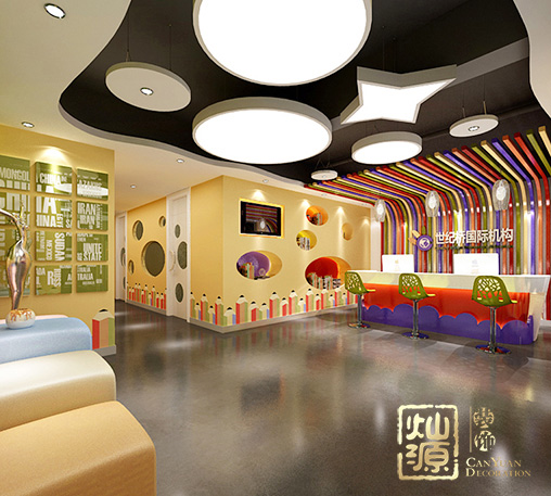 南寧培訓學校裝修設計進門大廳區(qū)域設計:因為設計師考慮本培訓機構主要是為10歲以下兒童業(yè)余培訓技能的場所,南寧培訓學校室內(nèi)裝修所有色彩方面主要以鮮艷紅、綠、黃、紫為主色調(diào),大廳中央將立柱設計成智慧樹進行裝飾,既寓意深刻又能供人們休息。天花運用月亮、星星、太陽等元素吊頂,亮麗的時尚桌椅將整個空間帶入一種夢幻境界。