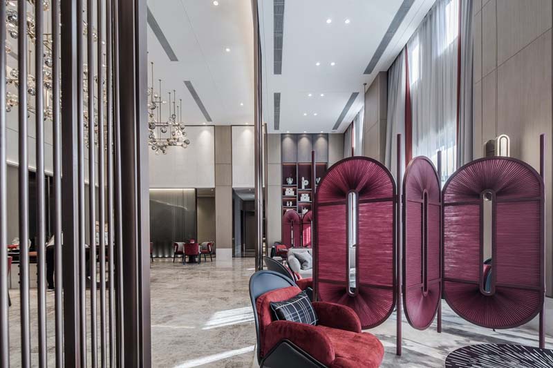 從整體布局上來看,本次南寧售樓部設(shè)計裝修項目,在前臺服務(wù)區(qū)的基礎(chǔ)上,增加了滿足單人、多人等不同消費(fèi)人數(shù)的休息洽談區(qū),圓桌圍坐與面談沙發(fā)的來那種模式,同時搭配應(yīng)對不同客戶類型;不同休息區(qū)之間還有線條鏤空、色彩亞克力等不同造型屏風(fēng)作為隔斷,滿足隱私性的同時,又不至于完全脫離主體空間,方便提供及時高效的銷售服務(wù)。